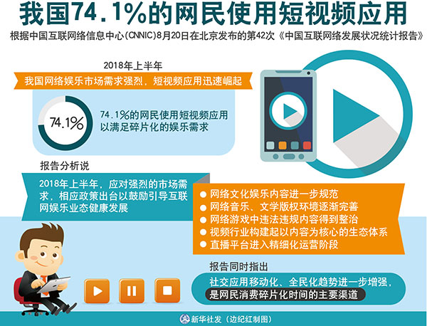 新華社北京8月20日電(記者施雨岑、王思北)根據(jù)中國互聯(lián)網(wǎng)絡(luò)信息中心(CNNIC)20日在京發(fā)布的第42次《中國互聯(lián)網(wǎng)絡(luò)發(fā)展?fàn)顩r統(tǒng)計報告》,2018年上半年,我國網(wǎng)絡(luò)娛樂市場需求強(qiáng)烈,短視頻應(yīng)用迅速崛起,74.1%的網(wǎng)民使用短視頻應(yīng)用,以滿足碎片化的娛樂需求。