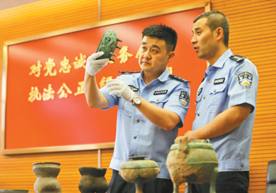 方正(左)和同事在清查追繳的涉案文物。張丹華攝