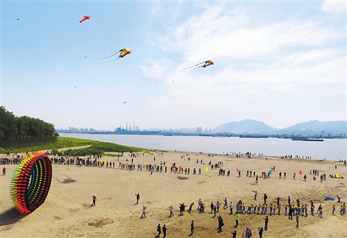 安徽省銅陵市義安區(qū)老洲鄉(xiāng)長江岸邊市民和游客在放風(fēng)箏。近年來,銅陵市挖掘長江文化元素,打造老洲長江沙灘風(fēng)箏旅游節(jié)、大通古鎮(zhèn)長江龍舟賽等特色長江旅游文化項目。 過仕寧攝