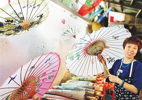 貴州省赤水市大同古鎮(zhèn),油紙傘傳人李珍霞在展示她制作的油紙傘。大同古鎮(zhèn)歷史悠久,擁有“獨(dú)竹漂”、竹編、油紙傘等非物質(zhì)文化遺產(chǎn)。 經(jīng)濟(jì)日報-中國經(jīng)濟(jì)網(wǎng)記者 周明陽攝