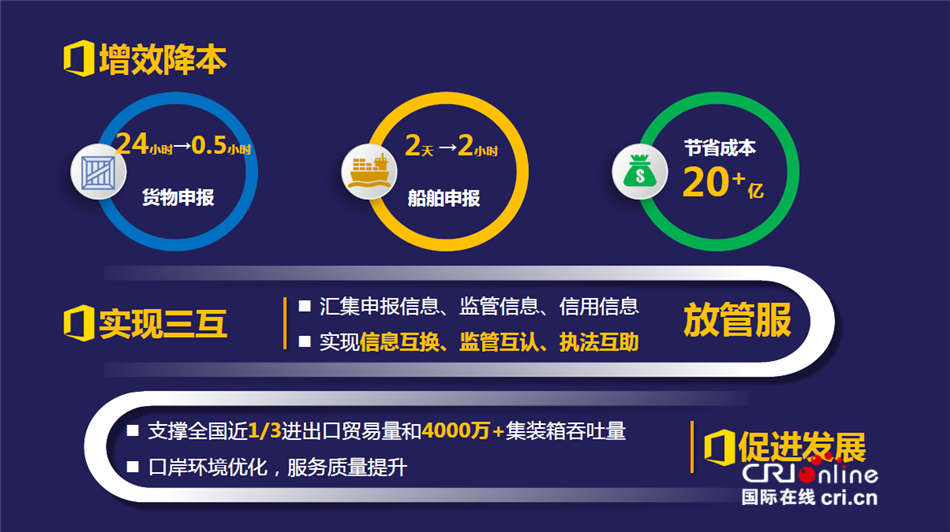 不僅如此,通關(guān)一體化改革后,出口貨物檢驗檢疫通關(guān)放行時間從原先的兩天半縮短至1天,每批貨物成本從200元人民幣降低為100元;進口貨物檢驗檢疫通關(guān)放行時間從一天半縮短為半天,每批貨物至少節(jié)約成本300元人民幣。