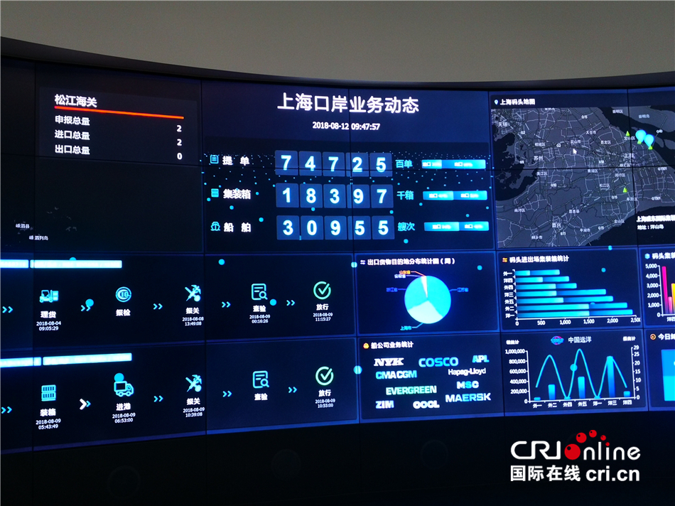 在上海國際貿(mào)易單一窗口運營方、上海億通公司的電子大屏上,密密麻麻的黃色光點顯示著全球船舶的實時坐標位置、上海口岸業(yè)務(wù)動態(tài)等關(guān)鍵信息。