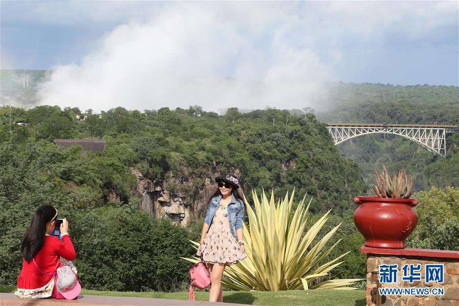 2017年1月27日,在津巴布韋維多利亞瀑布城,來自中國的一對母女以遠(yuǎn)處的贊比西鐵橋為背景拍照留念。近年來,春節(jié)假期期間前往非洲旅游的中國游客逐漸增多。? 新華社發(fā)(費列蒙攝)