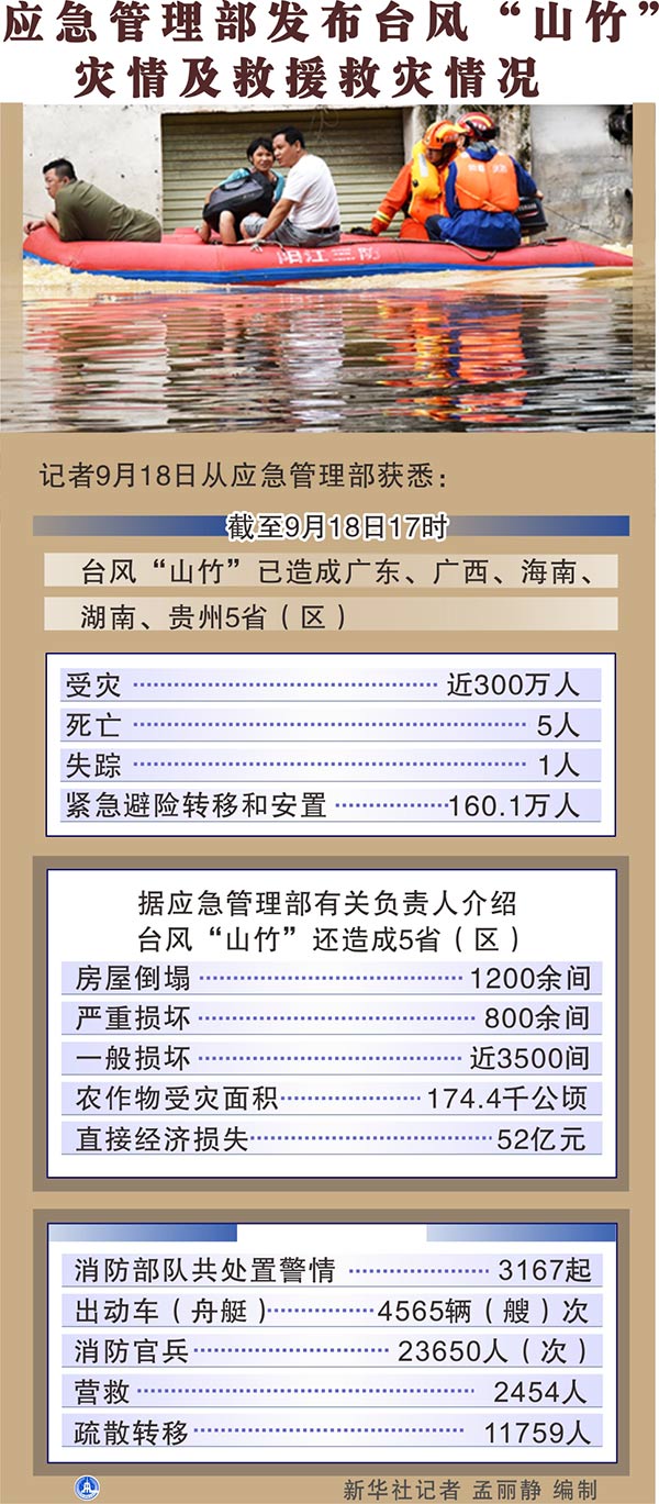 新華社北京9月18日電(記者葉昊鳴)記者18日從應(yīng)急管理部獲悉,截至18日17時(shí),臺風(fēng)“山竹”已造成廣東、廣西、海南、湖南、貴州5?。▍^(qū))近300萬人受災(zāi),5人死亡,1人失蹤,160.1萬人緊急避險(xiǎn)轉(zhuǎn)移和安置。