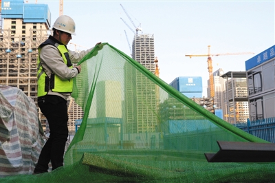今年2月,中國(guó)鐵物大廈項(xiàng)目工地配備網(wǎng)眼更細(xì)密的防塵網(wǎng),有助更好控制揚(yáng)塵污染。資料圖片/新京報(bào)記者 吳江 攝