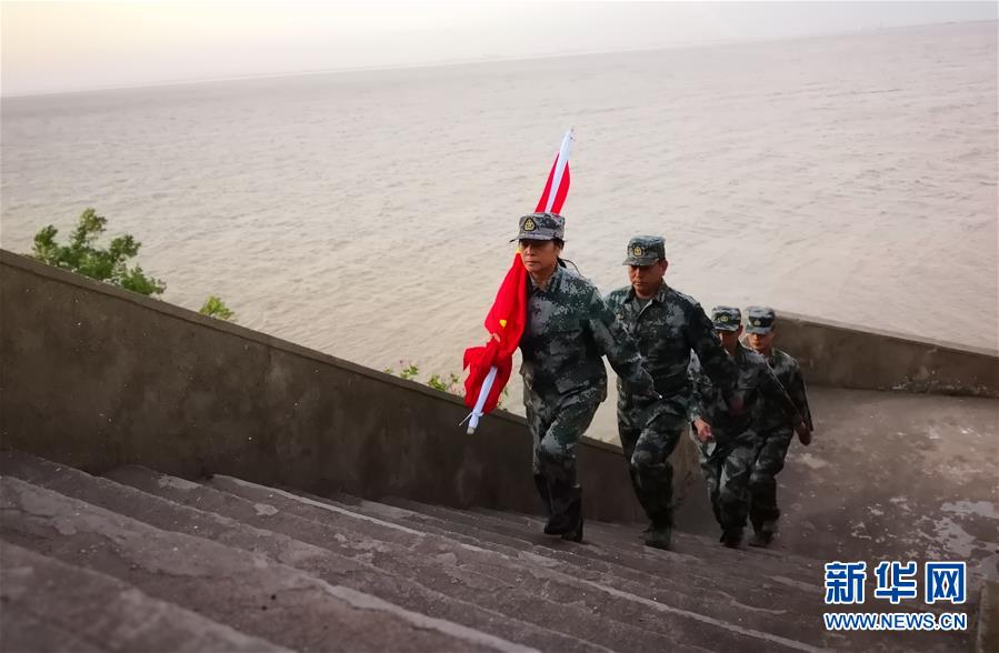 “1-2-1,1-2-1……”56歲的王仕花帶著3名守島民兵,迎著晨曦,肩扛國(guó)旗,向山頂?shù)纳炫_(tái)走去。