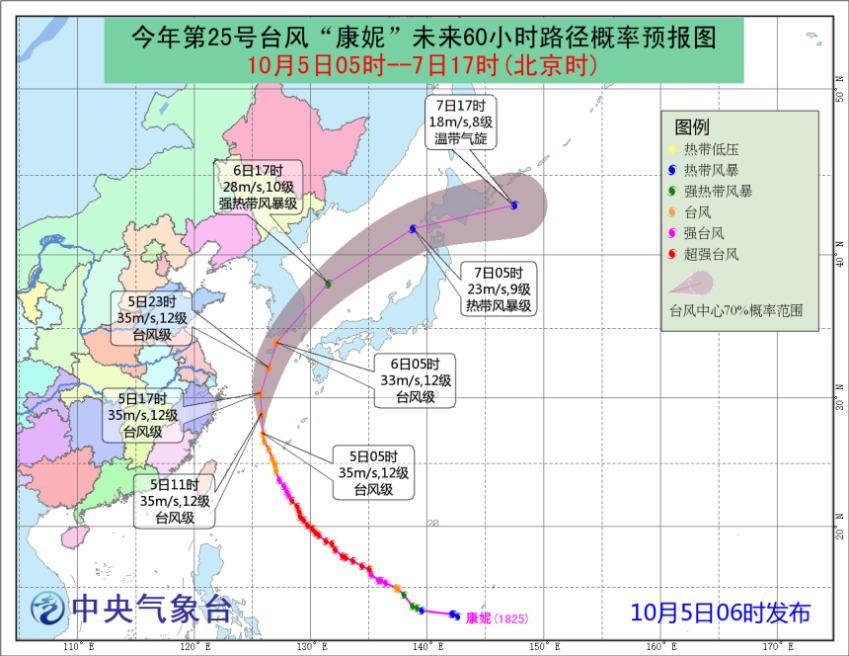受“康妮”和冷空氣的共同影響,我國(guó)東部海域?qū)⒂休^大風(fēng)雨,其中5日08時(shí)到6日08時(shí),黃海南部、東海、臺(tái)灣東北洋面、浙江東部及沿海、上海沿海、江蘇沿海、杭州灣、長(zhǎng)江口區(qū)將有7-10級(jí)大風(fēng),其中東海大部、黃海東南部的風(fēng)力可達(dá)11級(jí),“康妮”中心經(jīng)過(guò)的東海東北部部分海域風(fēng)力可達(dá)12級(jí),陣風(fēng)13-14級(jí),浙江東北部、上海東部局地有中到大雨。為此,中央氣象臺(tái)10月5日06時(shí)繼續(xù)發(fā)布臺(tái)風(fēng)藍(lán)色預(yù)警。