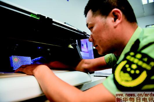 2018年8月7日,在位于南京祿口國際機場內(nèi)的南京邊防檢查站證件研究中心,王志國利用文檢設(shè)備進行證件研究。