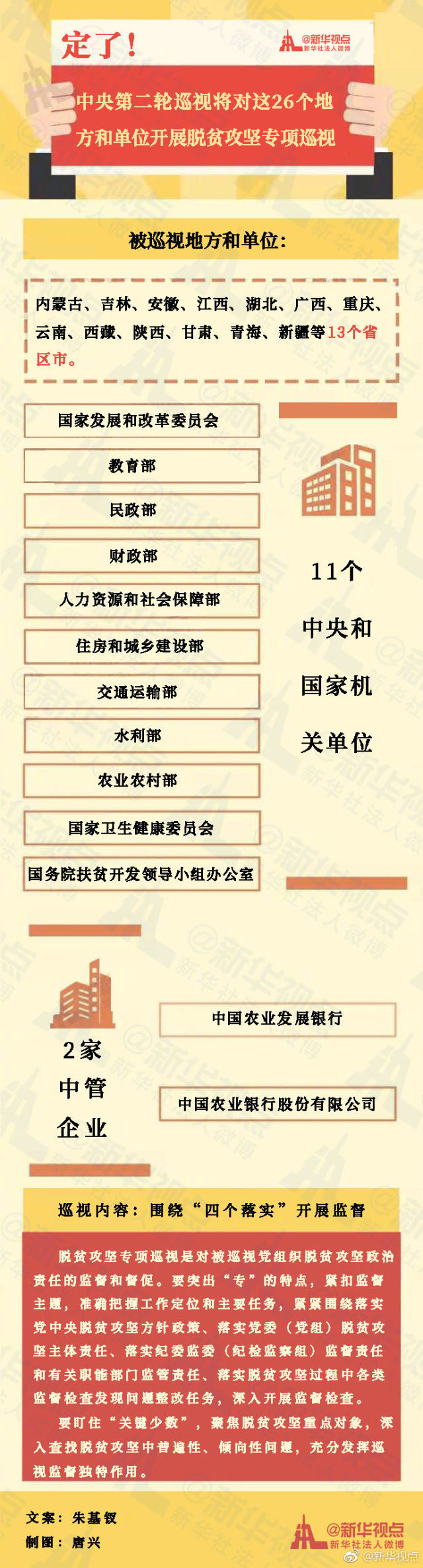 新華社北京10月9日電 經(jīng)黨中央批準(zhǔn),十九屆中央第二輪巡視將對內(nèi)蒙古、吉林、安徽、江西、湖北、廣西、重慶、云南、西藏、陜西、甘肅、青海、新疆、國家發(fā)展和改革委員會、教育部、民政部、財(cái)政部、人力資源和社會保障部、住房和城鄉(xiāng)建設(shè)部、交通運(yùn)輸部、水利部、農(nóng)業(yè)農(nóng)村部、國家衛(wèi)生健康委員會、國務(wù)院扶貧開發(fā)領(lǐng)導(dǎo)小組辦公室、中國農(nóng)業(yè)發(fā)展銀行、中國農(nóng)業(yè)銀行股份有限公司等26個(gè)地方、單位黨組織開展脫貧攻堅(jiān)專項(xiàng)巡視。