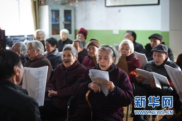 老人們?cè)谖錆h市武昌區(qū)一家民辦養(yǎng)老院內(nèi)練習(xí)合唱(2015年1月22日攝)。 新華社記者肖藝九攝