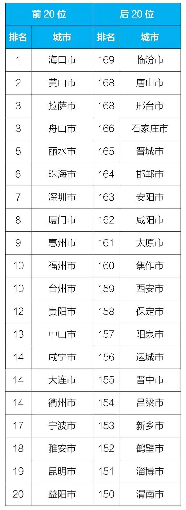 2018年9月169個重點城市排名前20位和后20位城市名單
