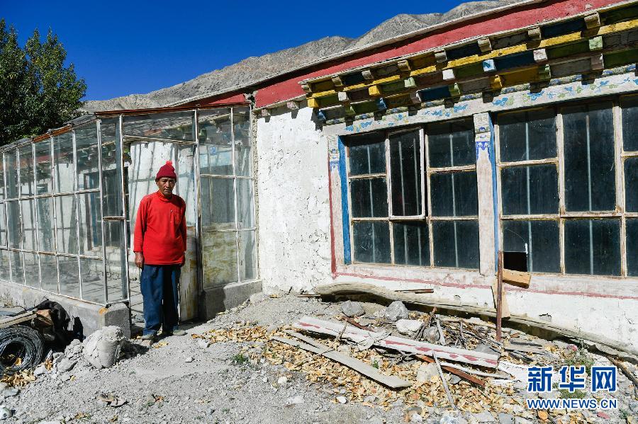 楚松村村民歐珠加措在他的第三代房前(9月16日攝)。新華社記者劉東君攝