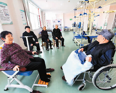 圖為山東省青州市,老人在醫(yī)養(yǎng)院里做康復(fù)訓(xùn)練。王繼林 攝(人民視覺(jué))