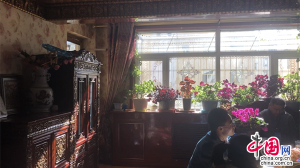 尕瑪文索的新家在統(tǒng)建區(qū)的一棟居民樓內,房間里擺滿了藏族特色的家具和裝飾品,各種花朵盆栽占據(jù)了整個陽臺?!靶路孔拥亩旌拖奶煲粯优停梢岳^續(xù)長,什么植物都可以養(yǎng)?!薄芭汀背闪随噩斘乃鲗π路孔幼畲蟮挠∠?。
