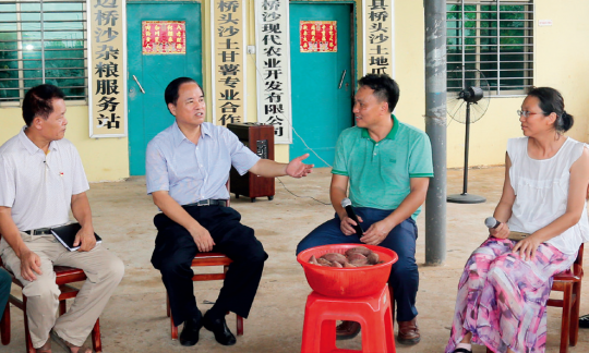 海南省委書記、省人大常委會主任劉賜貴(左二)在澄邁縣橋頭地瓜種植基地與當?shù)馗扇鹤?李英挺攝