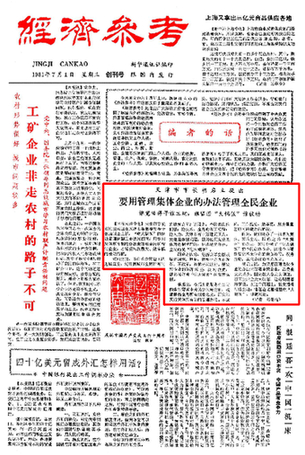 這是《經(jīng)濟參考報》的創(chuàng)刊號。在頭版《要用管理集體企業(yè)的辦法管理全民企業(yè)》一文中,時任天津市市長胡啟立表示,“吃大鍋飯”的經(jīng)濟管理體制已走進死胡同。如果用管理集體企業(yè)的辦法來管理全民企業(yè),浪費會大大減少,國家收入會大大增加,職工生活會大大改善,這是明擺著的事情。在這個問題上,誰覺悟得早誰主動;誰還在老框框里吃“大鍋飯”,誰就被動。