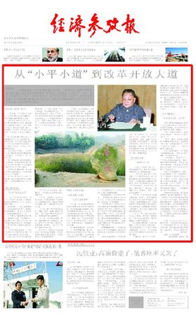2008年,也是中國改革開放30周年,《經(jīng)濟參考報》刊發(fā)《從“小平小道”到改革開放大道》。當年,受到錯誤批判的鄧小平同志被疏散到江西新建縣拖拉機廠勞動。在這條原本不是路、工友們?yōu)榱俗屗焕@遠路而悄悄修整出來的田邊小路上,鄧小平徘徊了三年、思考了三年。當鄧小平重新登上中國政治舞臺中心的時候,他帶領(lǐng)全國人民走上了一條沒有前人經(jīng)驗借鑒的改革開放大道。