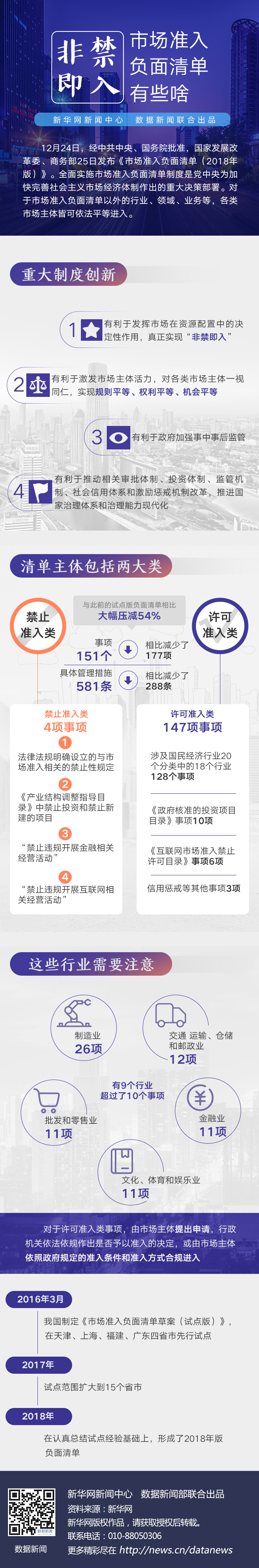 隨著《市場準(zhǔn)入負面清單(2018年版)》25日正式公布,我國市場準(zhǔn)入負面清單制度進入全面實施新階段,實現(xiàn)清單之外所有市場主體“非禁即入”。