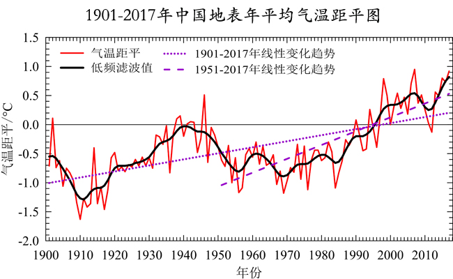 1901-2017年中國(guó)地表年平均氣溫距平圖 圖片數(shù)據(jù)來(lái)源:國(guó)家氣候中心
