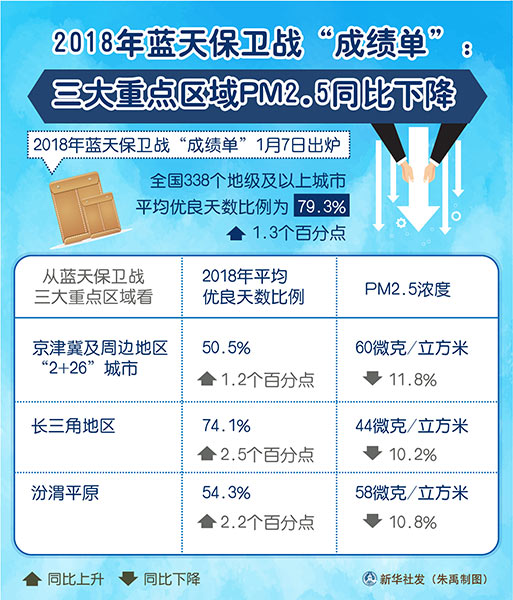 圖表:2018年藍(lán)天保衛(wèi)戰(zhàn)“成績單”:三大重點區(qū)域PM2.5同比下降 新華社發(fā) 朱禹 制圖