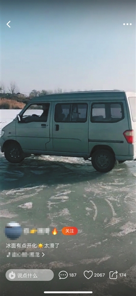 新京報記者在“快手”、“抖音”、“火山小視頻”、“西瓜視頻”等平臺搜索發(fā)現,面包車、越野車、小轎車甚至拖拉機、大卡車都是河湖冰面撒歡兒的主角,旋轉漂移、快速沖刺,隨著司機發(fā)出歡呼聲,車上的乘客被嚇得尖叫。