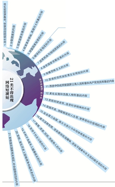 《規(guī)范》和《細則》針對網(wǎng)絡視聽領域存在的不足和薄弱環(huán)節(jié),分別對開展短視頻服務的網(wǎng)絡平臺以及網(wǎng)絡短視頻內(nèi)容審核的標準進行規(guī)范?!都殑t》明確了21類、100項內(nèi)容,“喪文化”“一夜情”“非主流婚戀觀”等都不得出現(xiàn)在短視頻中。