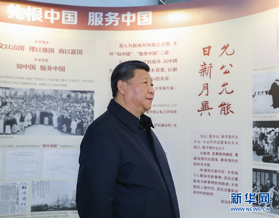 17日上午,習(xí)近平來到天津南開大學(xué)考察調(diào)研。南開大學(xué)成立于1919年,是一所具有光榮愛國(guó)傳統(tǒng)的名校。習(xí)近平參觀了校史展覽,詳細(xì)了解南開大學(xué)歷史沿革、學(xué)科建設(shè)、人才隊(duì)伍、科研創(chuàng)新等情況。習(xí)近平指出,學(xué)校是立德樹人的地方。愛國(guó)主義是中華民族的民族心、民族魂,培養(yǎng)社會(huì)主義建設(shè)者和接班人,首先要培養(yǎng)學(xué)生的愛國(guó)情懷。高校黨組織要把抓好學(xué)校黨建工作和思想政治工作作為辦學(xué)治校的基本功。習(xí)近平同在現(xiàn)場(chǎng)的部分院士、專家及中青年教師代表進(jìn)行了交流。他指出,專家型教師隊(duì)伍是大學(xué)的核心競(jìng)爭(zhēng)力。要把建設(shè)政治素質(zhì)過硬、業(yè)務(wù)能力精湛、育人水平高超的高素質(zhì)教師隊(duì)伍作為大學(xué)建設(shè)的基礎(chǔ)性工作,始終抓緊抓好。在元素有機(jī)化學(xué)國(guó)家重點(diǎn)實(shí)驗(yàn)室,他強(qiáng)調(diào),要加快一流大學(xué)和一流學(xué)科建設(shè),加強(qiáng)基礎(chǔ)研究,力爭(zhēng)在原始創(chuàng)新和自主創(chuàng)新上出更多成果,勇攀世界科技高峰。他勉勵(lì)師生們把學(xué)習(xí)奮斗的具體目標(biāo)同民族復(fù)興的偉大目標(biāo)結(jié)合起來,把小我融入大我,立志作出我們這一代人的歷史貢獻(xiàn)。走出實(shí)驗(yàn)室,廣場(chǎng)上擠滿了學(xué)生,大家高呼“總書記好”、“總書記辛苦”,齊聲高喊“愛我中華、振興中華”,還唱起《我和我的祖國(guó)》。習(xí)近平同近處的同學(xué)親切握手,向遠(yuǎn)處的同學(xué)們招手致意。掌聲、歌聲、歡呼聲在校園里久久回蕩。