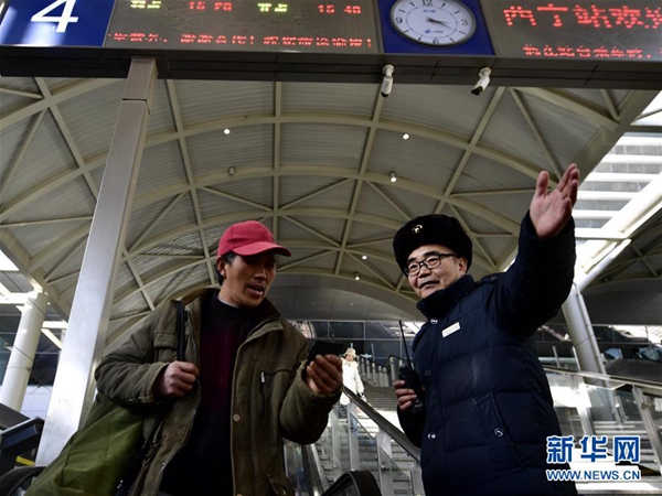 1月16日,李誠在西寧站巡查是否有旅客誤乘。新華社發(fā)(張龍 攝)
