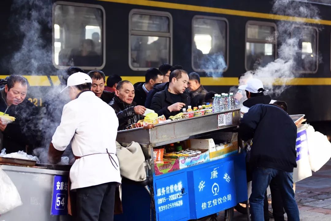 2019-01-22,陜西省安康市。呼和浩特至昆明K691次列車到達(dá)安康站,旅客被站臺(tái)售賣的美食所吸引。作者:玩家