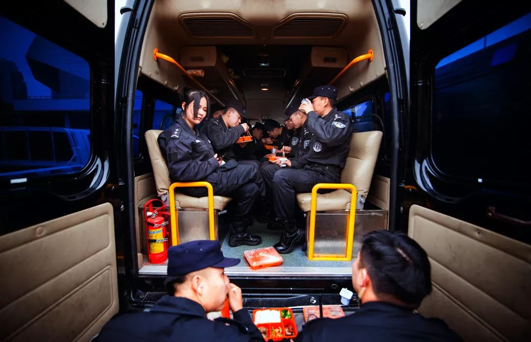 2019-01-30,江蘇省太倉(cāng)市。安保人員在執(zhí)行任務(wù)時(shí)就地晚餐。作者:漫畫(huà)旅館