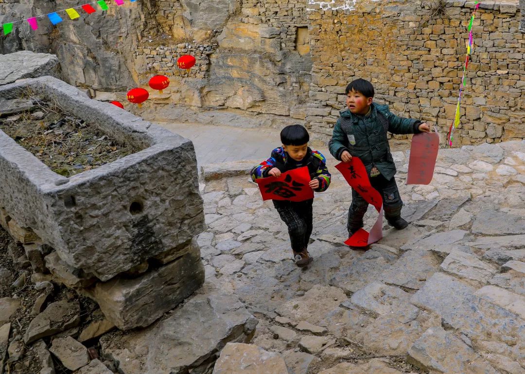 2019-01-29,河北省涉縣大洼村。新春到來(lái)之際,書(shū)畫(huà)大師下鄉(xiāng)進(jìn)山溝,揮毫潑墨送溫暖,倆村娃興致勃勃將福字春聯(lián)帶回家。作者:滄海