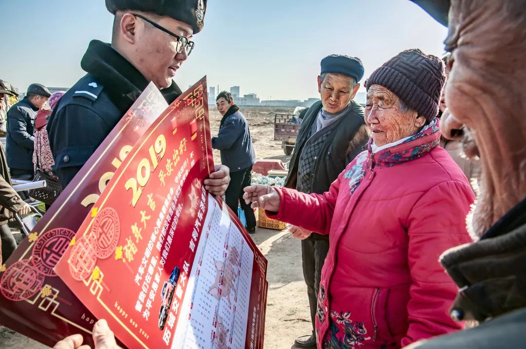 2019-02-01,山東省濟(jì)南市潘莊村。就在這家家戶(hù)戶(hù)都在忙年的時(shí)刻,交警來(lái)到集上為趕集人贈(zèng)送年歷,提醒人們節(jié)日期間注意交通安全。作者:程普麟