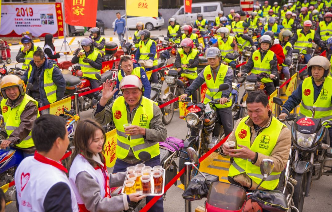 2019-01-21,廣東省佛山市順德區(qū)。摩托返鄉(xiāng)大軍中,出現(xiàn)一張俏麗的笑臉,給農(nóng)民工大哥端上一杯熱茶。作者:獲得生命