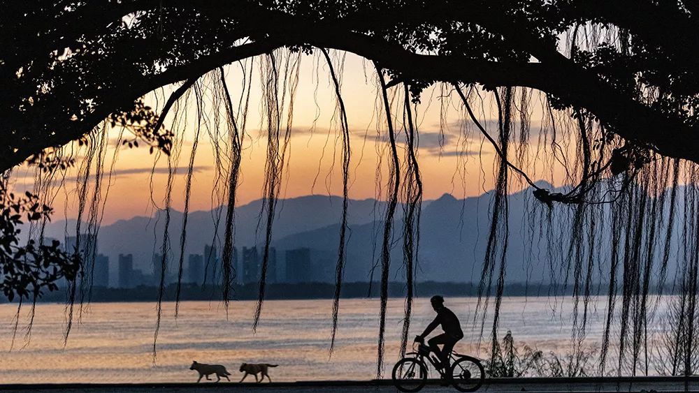 2019-01-19,福建省福州市。日落時(shí)分,休閑運(yùn)動(dòng)的騎車健身者帶著小狗一起享受溫暖的陽光。作者:周志強(qiáng)