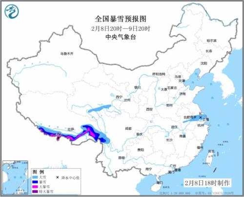 2月8日20時至9日20時,青藏高原東部和南部、甘肅中部和南部、蘇皖大部等地的部分地區(qū)有中到大雪或雨夾雪,其中,西藏南部和東部的部分地區(qū)有暴雪,局地有大暴雪或特大暴雪(30~40毫米)。西藏東南部、江南大部、西南地區(qū)東部和華南北部等地有小到中雨,其中,西藏東南部、云南西北部等地局地有大雨或暴雨(25~80毫米)。西藏中西部、華北北部、遼東半島、江漢、江南東北部等地的部分地區(qū)有4~6級風。