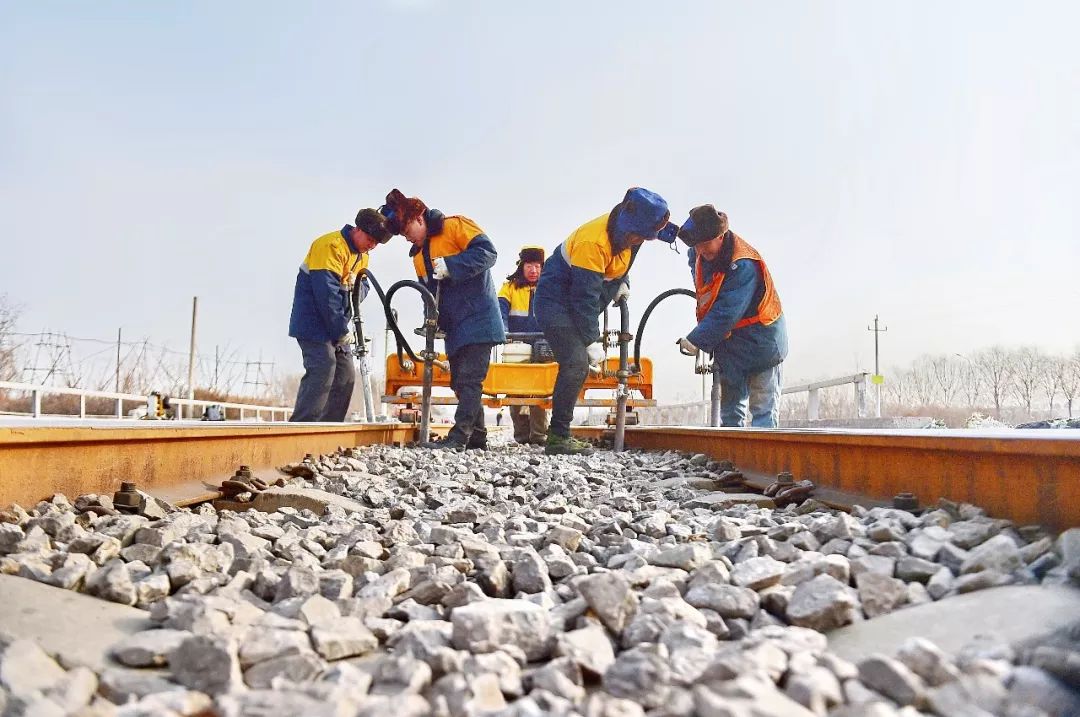 2019-02-06,河北省唐山市。北京局鐵路集團(tuán)公司所轄的七灤線上,工務(wù)工人正在搗固線路,確保春運行車安全。作者:養(yǎng)路工