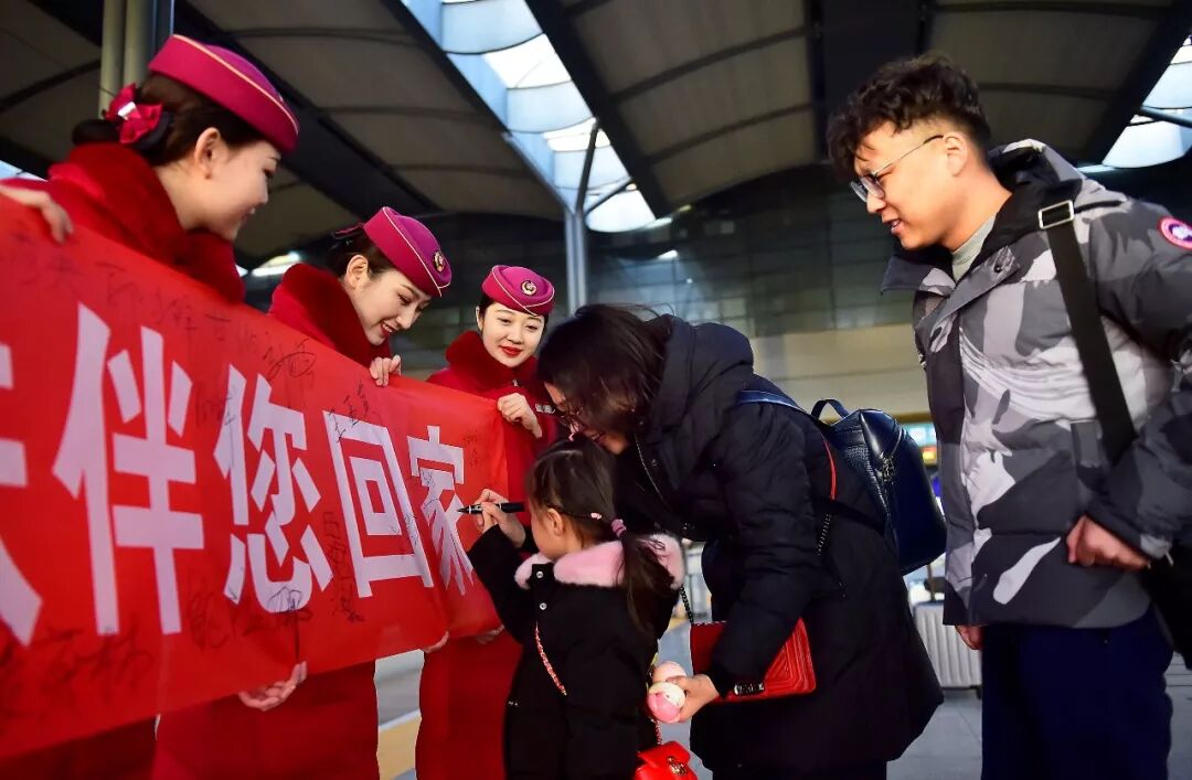 2019-02-03,天津西站。開車前,旅客與列車乘務(wù)人員在天津西站站臺上共同寫下新年祝福。作者:三木