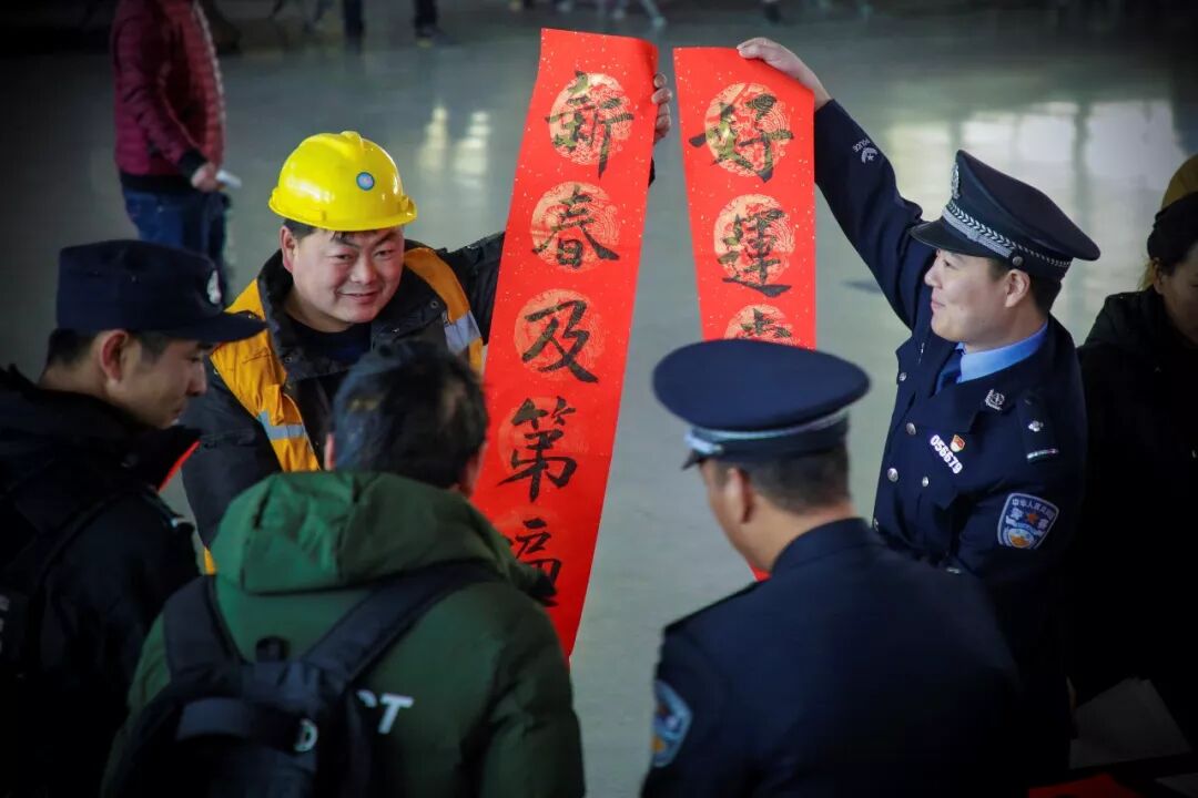 2019-01-21,河南省洛陽市。為城市地鐵建設(shè)忙活一年的工人師傅也乘車回家過年,鐵路民警為其送上春聯(lián),希望他們新年越來越好。作者:陳國軍