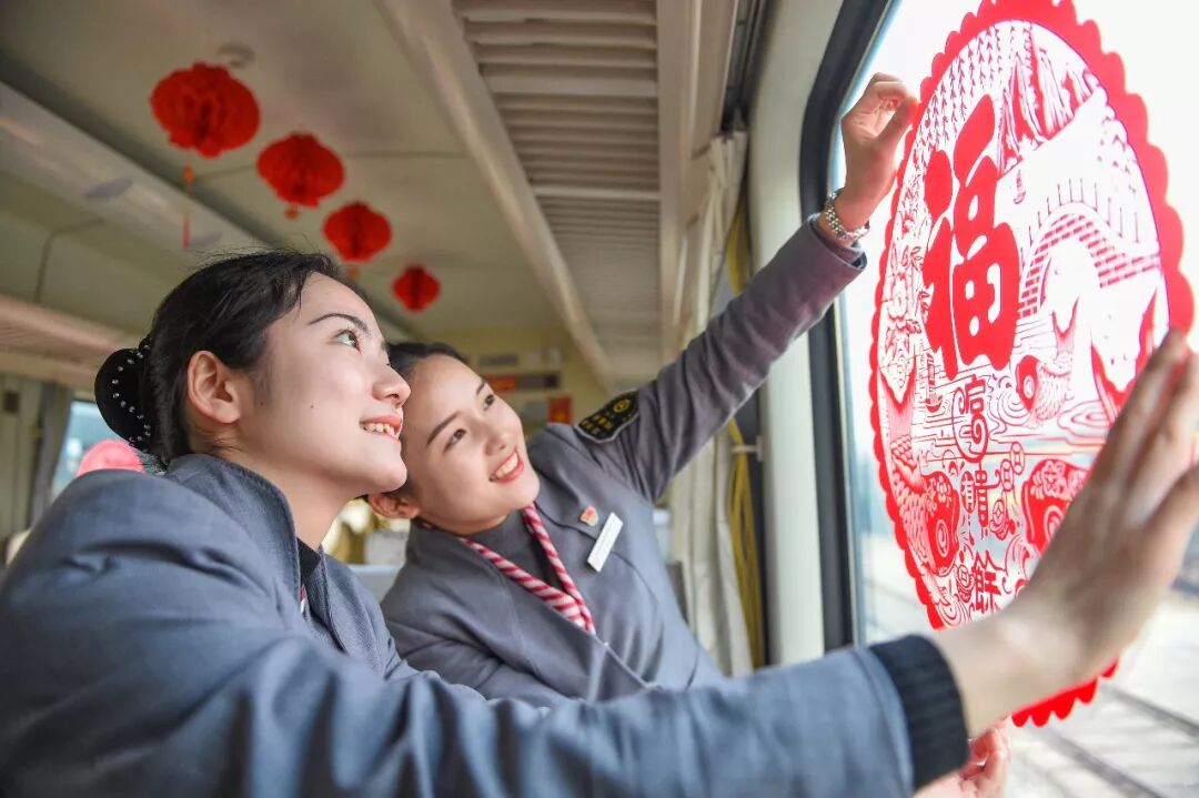 2019-01-29,江西省南昌市。南昌至北京西的Z68次列車上,乘務(wù)員在車上貼上窗花,為旅客準(zhǔn)備免費書籍、玩具和春節(jié)物品等,營造濃濃的年味兒。作者:清風(fēng)吹過60年