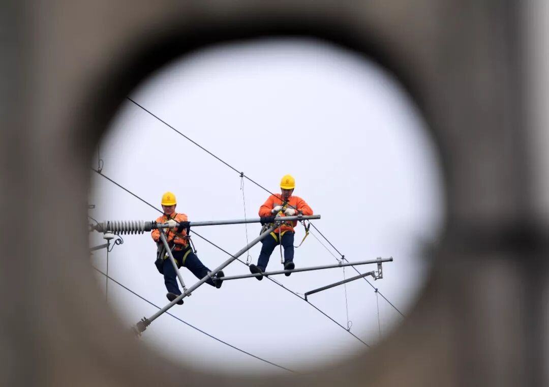 2019-02-06,江西九江。中國鐵路南昌局集團(tuán)有限公司南昌供電段的職工在武九鐵路瑞昌區(qū)段檢修保養(yǎng)接觸網(wǎng)設(shè)備,以迎接節(jié)后鐵路運輸高峰。作者:江山如畫
