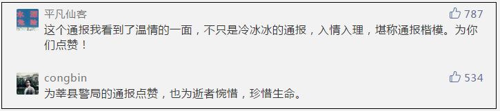 通報(bào)發(fā)布后,獲得眾多網(wǎng)友點(diǎn)贊。昨日(10日),記者從撰寫通報(bào)的莘縣公安局宣傳科室了解到,“另類”行文是“希望大家看到通報(bào)能夠體諒他家人的感受,不再傳播血腥視頻,不再惡意揣測死因”。