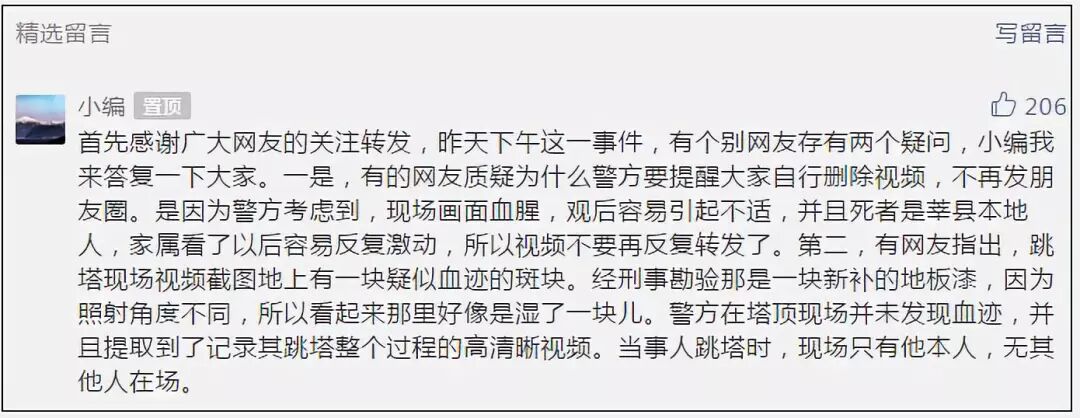 “我們就在通報(bào)的基礎(chǔ)上,通過留言進(jìn)行了辟謠和提醒?!本奖硎?,就此事有個(gè)別網(wǎng)友存有兩個(gè)疑問:一是,質(zhì)疑為什么警方要提醒大家自行刪除視頻。警方解釋,現(xiàn)場畫面血腥,觀后容易引起不適,并且死者是莘縣本地人,家屬看了以后容易反復(fù)激動。二是,網(wǎng)友指出,跳塔現(xiàn)場視頻截圖地上有一塊疑似血跡的斑塊。經(jīng)刑事勘驗(yàn)?zāi)鞘且粔K新補(bǔ)的地板漆,因照射角度不同,所以看起來那里好像是濕了一塊兒。警方在現(xiàn)場并未發(fā)現(xiàn)血跡,此外,當(dāng)事人跳塔時(shí),現(xiàn)場只有他本人。