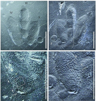 古生物學(xué)家還發(fā)現(xiàn),小龍足跡的鱗片模式與其他肉食性獸腳類恐龍的足跡相似,而明顯區(qū)別于古鳥類的腳底鱗片模式。此前發(fā)現(xiàn)的肉食性獸腳類恐龍足跡的鱗片要大得多,直徑可達(dá)2厘米左右,大約一個(gè)硬幣那么大?!斑@表明所有的獸腳類恐龍都有類似的鱗片模式,小龍足跡上精致的保存完好的鱗片模式,就像比它大得多的近親鱗片的縮小版?!毙狭⑦_(dá)說。(記者張蕾)