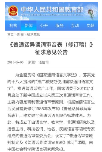 1985年,國(guó)家發(fā)布《普通話異讀詞審音表》,對(duì)一些異讀詞進(jìn)行了修訂。2016發(fā)布的《<普通話異讀詞審音表(修訂稿)>征求意見(jiàn)稿》又對(duì)一些讀音進(jìn)行了新的修訂,并發(fā)布在教育部網(wǎng)站上征求意見(jiàn)。