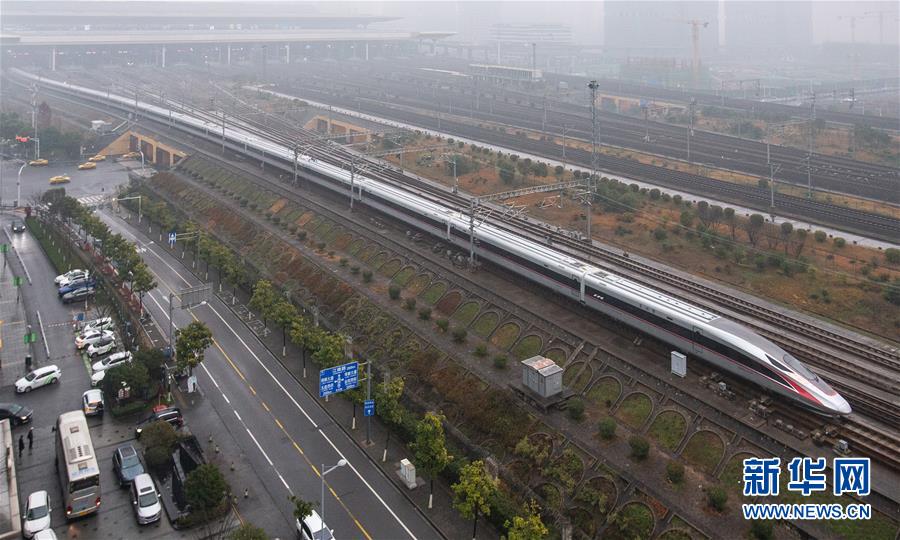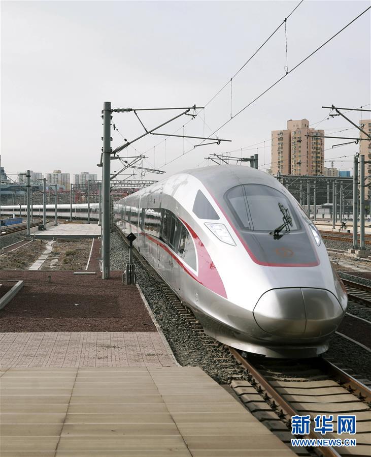 1月5日,G9次超長版“復興號”動車組列車駛?cè)肽暇┠险尽P氯A社發(fā)(蘇陽 攝)