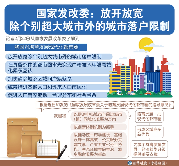 新華社北京2月22日電(安蓓、齊琪)記者22日從國家發(fā)展改革委了解到,我國將培育發(fā)展現(xiàn)代化都市圈。放開放寬除個別超大城市外的城市落戶限制,在具備條件的都市圈率先實現(xiàn)戶籍準(zhǔn)入年限同城化累積互認(rèn),加快消除城鄉(xiāng)區(qū)域間戶籍壁壘,統(tǒng)籌推進(jìn)本地人口和外來人口市民化,促進(jìn)人口有序流動、合理分布和社會融合。