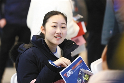 昨日,北京春季國(guó)展人才招聘會(huì)上,一名來(lái)應(yīng)聘的女士在與用人單位洽談。圖/視覺中國(guó)