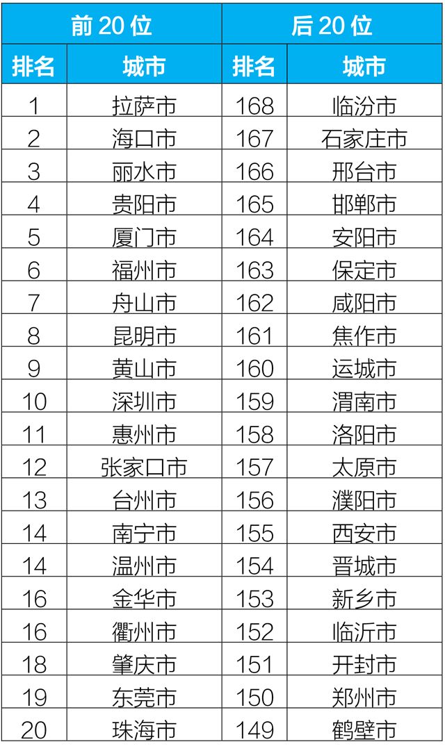 2019年2月168個(gè)重點(diǎn)城市排名前20位和后20位城市名單