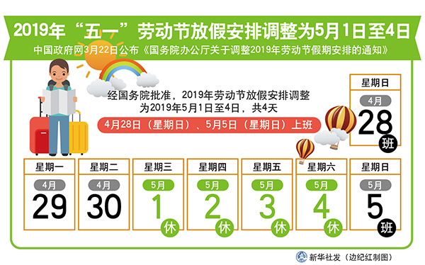 圖表:2019年“五一”勞動節(jié)放假安排調(diào)整為5月1日至4日 新華社發(fā) 邊紀紅 制圖
