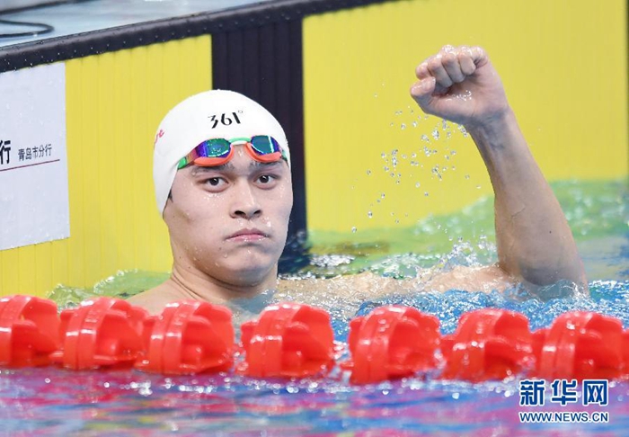 3月30日,浙江隊(duì)選手孫楊在男子1500米自由泳預(yù)賽后慶祝,他以15分14秒21的成績(jī)排名預(yù)賽第一,并晉級(jí)決賽。當(dāng)日,在山東省青島市舉行的2019年全國(guó)游泳冠軍賽暨世錦賽選拔賽進(jìn)入第七個(gè)比賽日。 新華社記者李紫恒攝